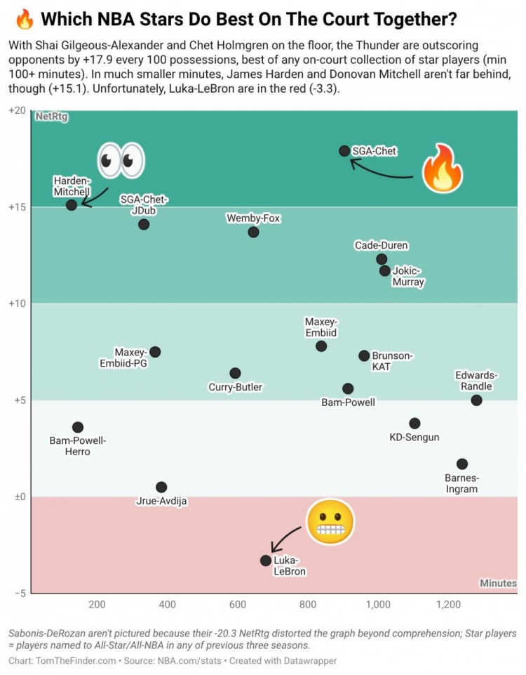 3月4日讯 近日,数据专家Tom Haberstroh晒图总结了本赛季联盟中同场最能赢分的球星双人组。